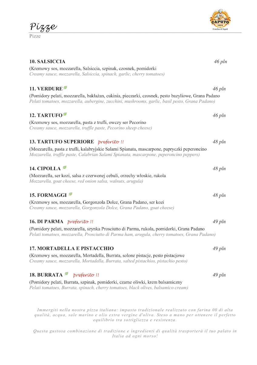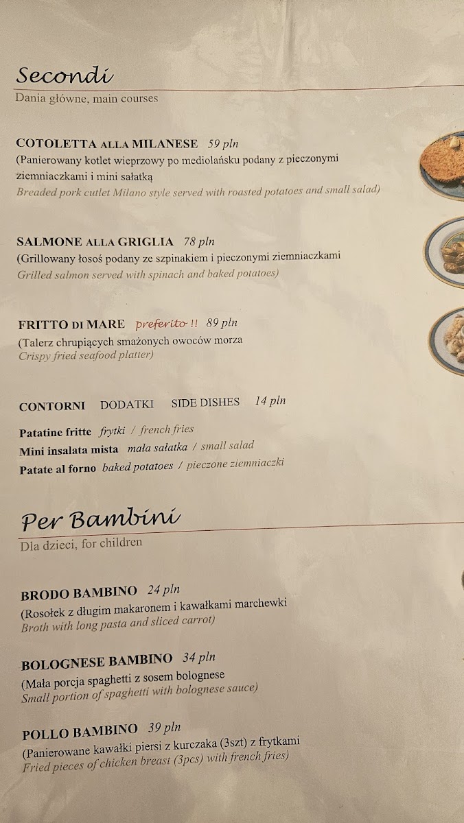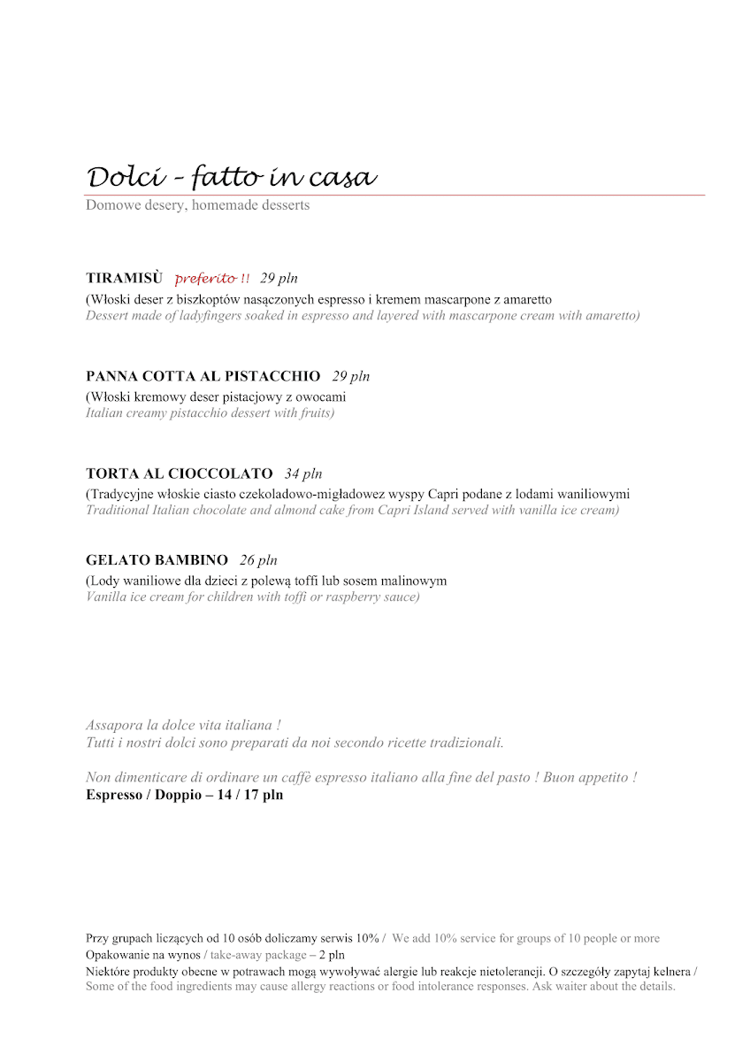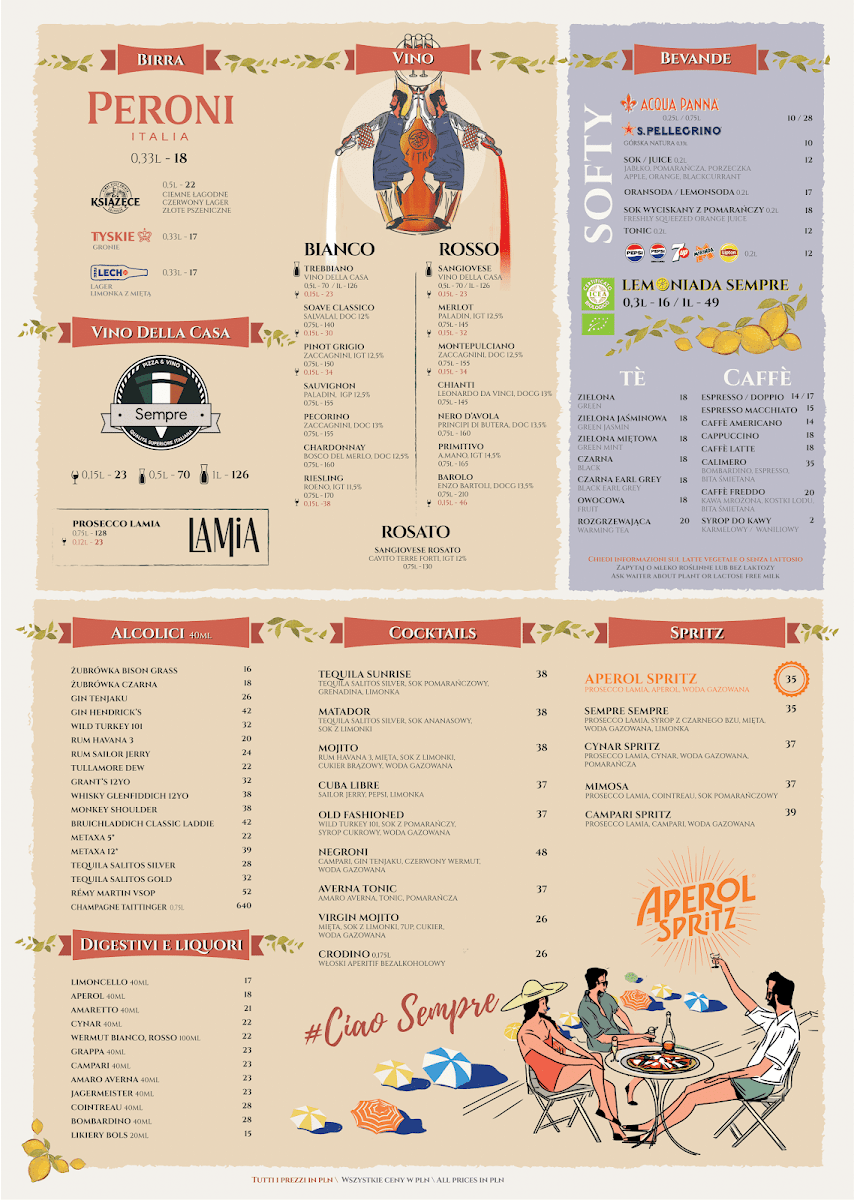 Alongside the food, a variety of authentic Italian beverages enhances the experience. Aperol Spritz and Margarita cocktails provide refreshing accompaniments during warmer days, while warming drinks like Herbata Zimowa invite guests to unwind in the cooler months. The menu also offers classic desserts including Tiramisu and Panna Cotta, perfect for ending a meal with a subtle sweetness.